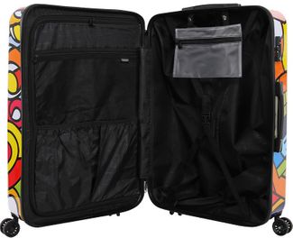 Extraordinary and bright, the Trifoce Francisco Ceron Pop Art Music & Flowers 30" hardside spinner luggage is ideal for longer journeys. It is striking and easy to spot at crowded baggage carousels. Styling is apparent and it has the features you want in your luggage. Dual spinner wheels let you glide the luggage effortlessly in any direction and you can walk to your destination with the bag rolling right beside you. The built-in combination lock is TSA approved for travel by the airlines. A divided interior keeps your packing and unpacking organized. We include a FREE leather luggage tag monogrammed with your initials and shipping is FREE of charge.